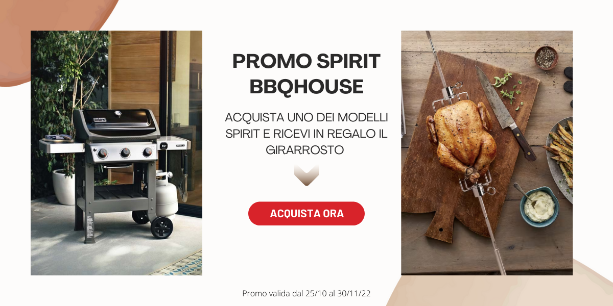Acquista un barbecue modello SPIRIT a tua scelta presso il nostro negozio o sul nostro sito online e riceverai insieme al tuo ordine un girarrosto Weber per barbecue spirit. Promo valida dal 25/10 al 30 /11/22.