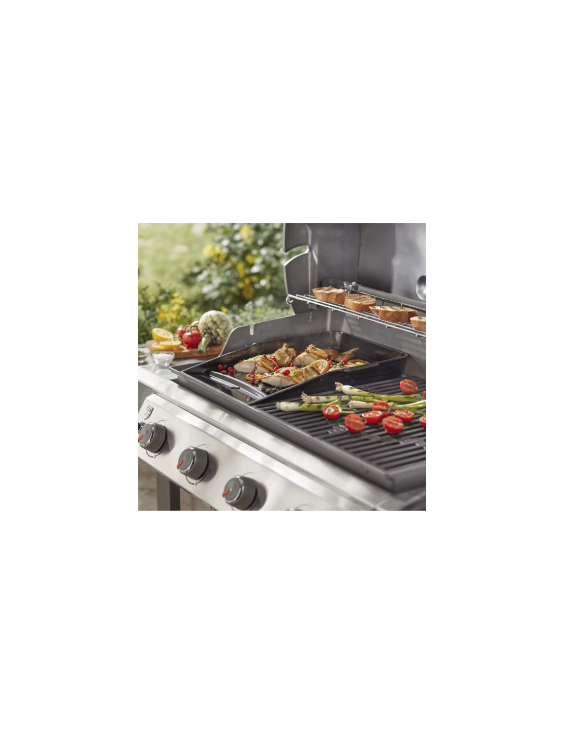 La piastra Deluxe sostituisce una delle griglie di cottura nel tuo barbecue a gas Genesis II. È perfetta per grigliare i cibi delicati, come crostacei, uova, verdure tagliuzzate e cibi in piccoli pezzi che altrimenti cadrebbero attraverso la griglia di cottura. Ha una superficie lucida, rivestita in porcellana, facile da pulire e non necessita di essere oliata.